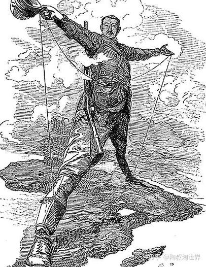 罗得斯是英国殖民非洲的核心人物,他被描绘为一个巨人,一只脚踩在南非开普敦,另一只脚迈向埃及开罗,身体横跨非洲大陆,他的手中还握着铁路轨道和电报线。该漫画旨在凸显(  )