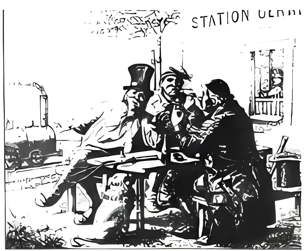 1825年,世界第一条铁路正式营运通车。开业典礼当天,人们欢呼雀跃,也有人对这个庞然大物投去怀疑的目光。漫画中,头戴礼帽、斜侧身体的人面带嘲弄地问另外两个人:“你们能告诉我,那个吐白烟的机器,所谓19世纪最伟大的发明,是靠什么行走的吗?”两人答道:“我们也不知道,车里头也许藏着一匹匹马。”
