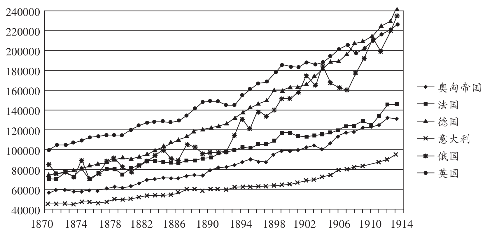 以1990年的国际元为基准的1870年到1914年六个主要经济体的国内生产总值