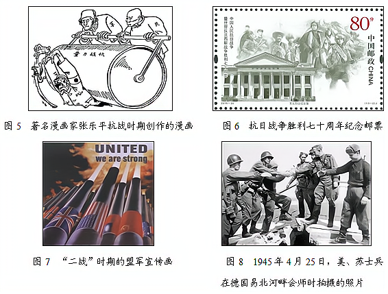 (2)宣传画是战争时期舆论宣传的重要形式,隐含了丰富的历史信息。从图7中可以获取哪些历史信息?(至少写2条)(4分) (3)以上哪三幅图属于第一手史料?(写出图片号码即可)(3分)这些第一手史料共同反映的时代主题是什么?(1分)